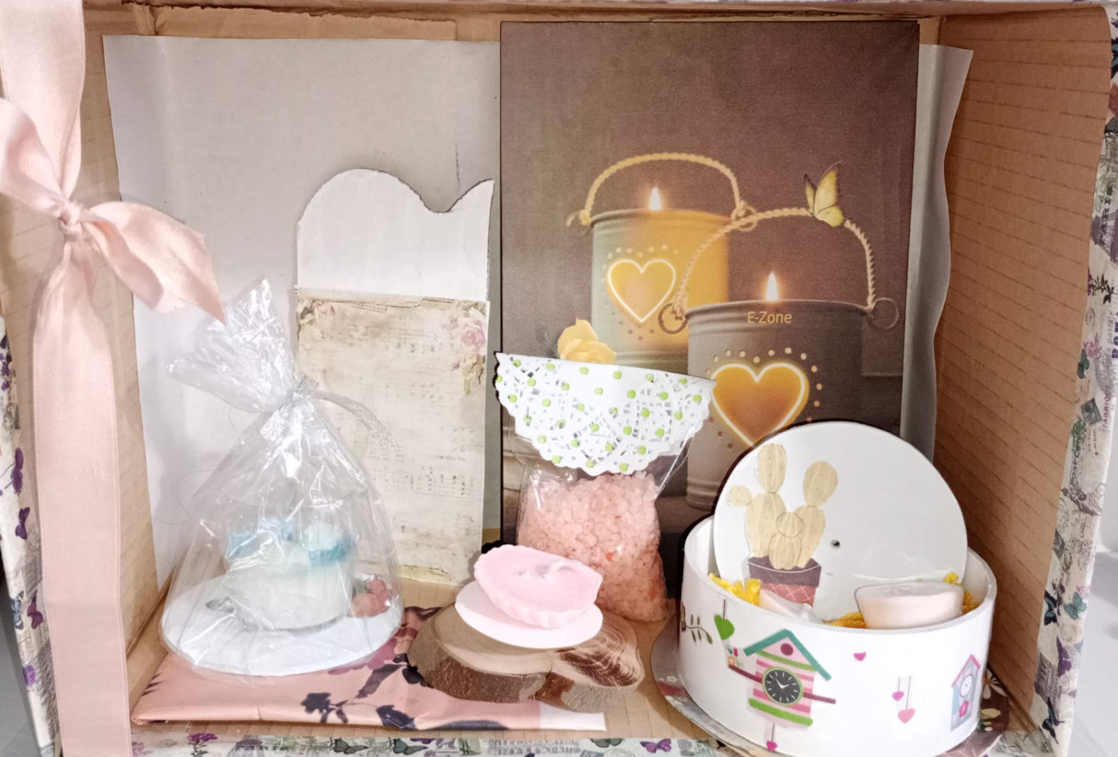 Para iluminar el alma. 🔥 Esta propuesta incluye una lámina decorativa de faroles con luz cálida, sales rosadas, una vela sobre rodaja de madera y un original contenedor redondo decorado con casitas y cactus. 🌵