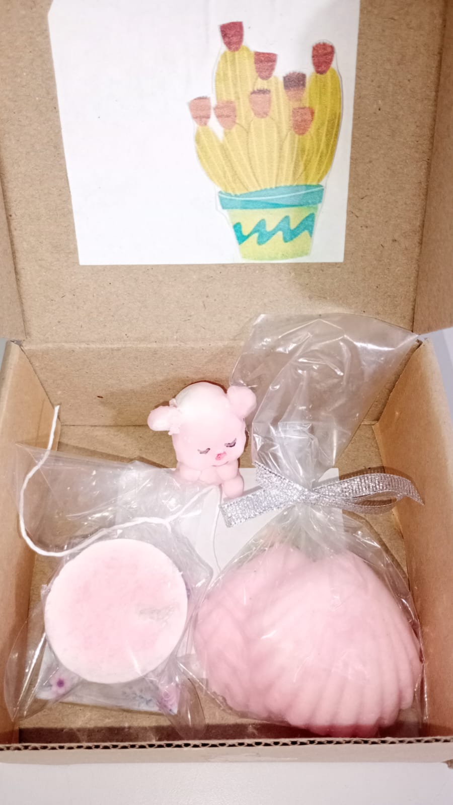 Para l@s fans de los aromas dulces y el color rosa. Esta caja combina unas sales de baño aromáticas con una vela protagonista aroma vainilla y detalles de corazones con brillitos.