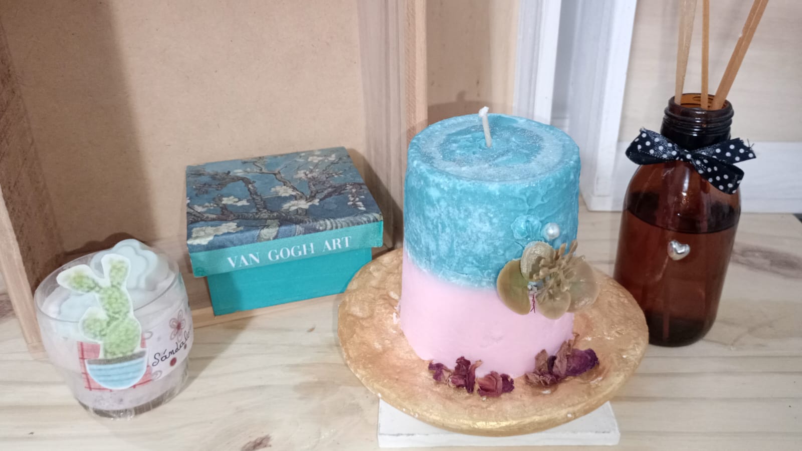 Un rincón lleno de estilo. 🌟 Protagonizado por una gran vela texturizada en dos tonos (azul y rosa) sobre base dorada, acompañada de un difusor ámbar y detalles artísticos como la cajita Van Gogh. Ideal para decorar con personalidad. 💙💗